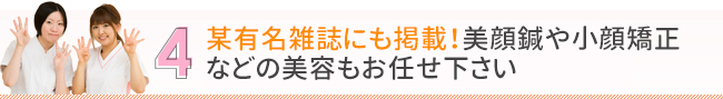 スタッフの女性率80%以上! 国家資格者が行う美顔鍼・小顔矯正・リンパ・骨盤調整など、美容メニューも充実!
